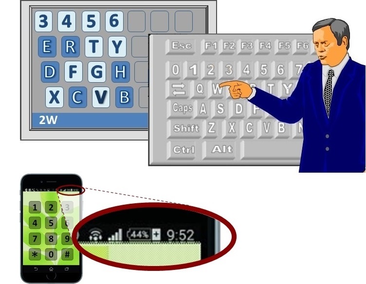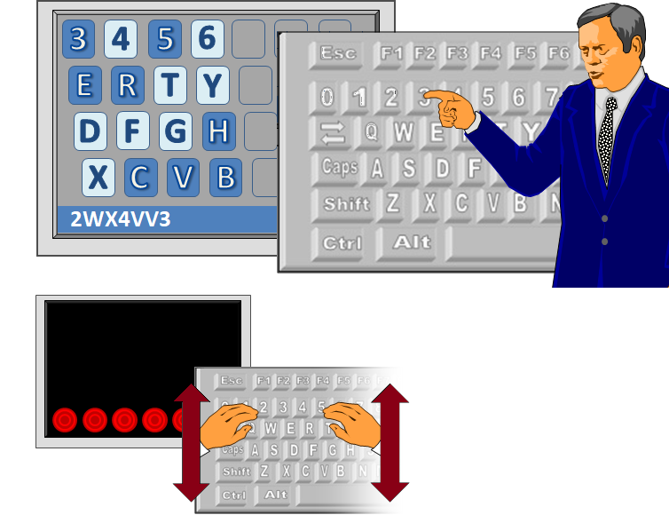 ⓘTermészetesen ez a momentum (szintén) lehet egy más jellegű input a Differ-User részéről. Ez lehet egy kombinált gomnyomás pl. Shift-tel, Ctrl-lel együttesen. Vagy (rejtetten) egy hosszabb idejű gombnyomás. Egérrel egy másfajta pozícionálás. Többfaktoros jelként egy telefonhívással, sms-sel. Arra azonban figyelni kell a konkrét termék-fejlesztőnek, hogy az a momentum ne legyen támpont a Támadónak, azaz kellőképpen homogén maradjon az adatbeviteli összkép.