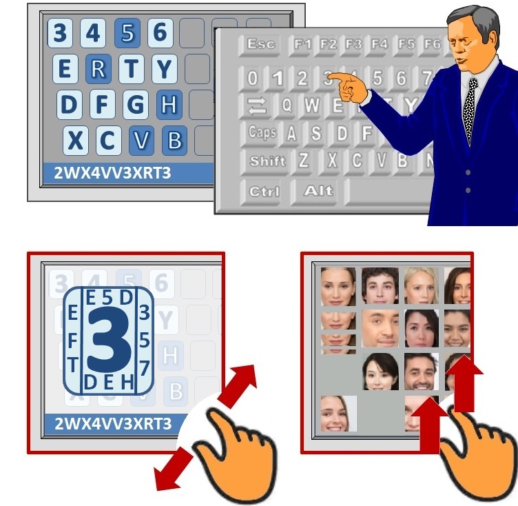 ⓘA Differáció felfogható úgy, mint egy többlépcsős captcha teszt-változat, ahol a Támadó és a Differ-van megkülönböztetve. Lényegében arról van szó, hogy az ID-GUI-n a raszter szerinti kitüntett jeleket (pl. gombok, arcok, mezők) értelmezendő képként kell azonosítani a Usernek. A kiválasztás lehet egyszerűen rámutatás, de megkövetelt lehet más olyan érintés-akció, ami már a tablettek és okostelefonok korában megszokott.