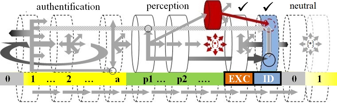 ⓘAz ID-GUI szubjektum-centralizáltsága a legjobban akkor aknázható ki, ha (az adatként feljegyezhető) gombképek helyett a Differ-User személyéhez kötődő ábrák, fotók a kiválasztható elemek. Nem csak arról van szó, hogy senki más nem látja át azt a személyes jelleget, mint a maga személyeben érintett Differ-User, hanem az is lényegi momentum, hogy ilyen módon sokkal nehezebb megérteni a Támadó számára a mintát vagy a választás miértjét. Ezáltal jobban elmósódik a determináns teljesítésének ténye (például itt, a tájékozódási szakasz lezáró momentumánál is).